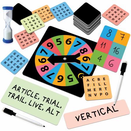 Contents: 45 Letter cards; 1 spinner; 1 hourglass; 2 boards; 1 erasable marker; 1 score sheet; Rules