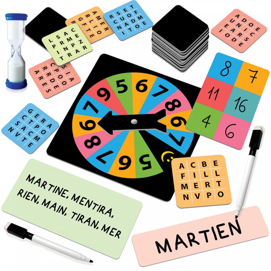 Contenu: 45 cartes-lettres ; 1 girouette ; 1 sablier ; 2 ardoisettes ; 1 feutre effaçable ; 1 fiche-score ; Règles du jeu