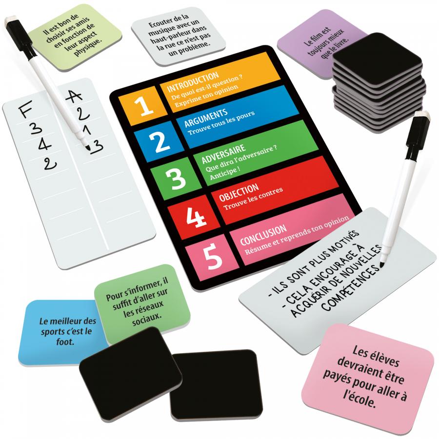Contenu: 42 cartes thèse-antithèse ; 1 fiche-structure du discours ; 2 ardoisettes ; 1 fiche-score ; 2 feutres effaçables ; Règles du jeu