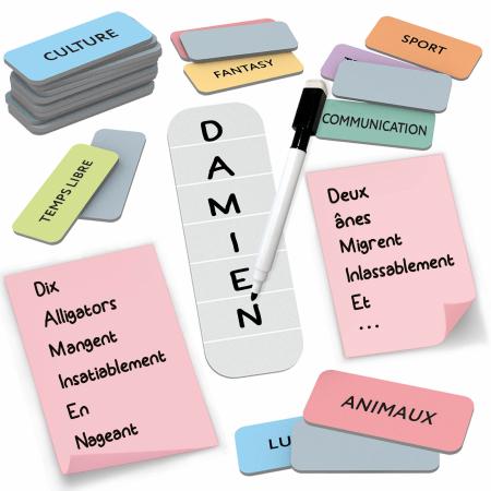 26 cartes-thème ; 1 fiche-nom ; 1 feutre effaçable ; Règles du jeu