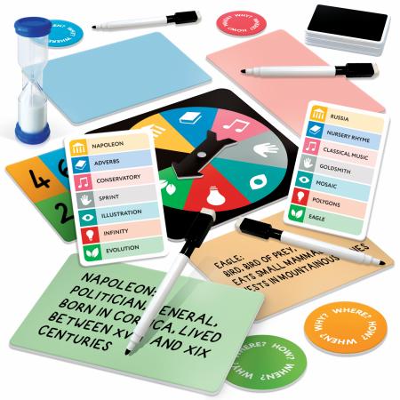 Contents: 1 deck of 60 knowledge cards; 4 tokens plus; 1 spinner; 4 boards; 1 hourglass; 1 score card; 4 erasable markers; Rules