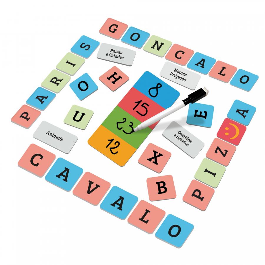 Conteúdo: 69 peças de letras; 4 peças joker; 10 cartões de categorias; 1 quadro branco; 1 quadro de pontuação; 1 marcador apagável; Regras