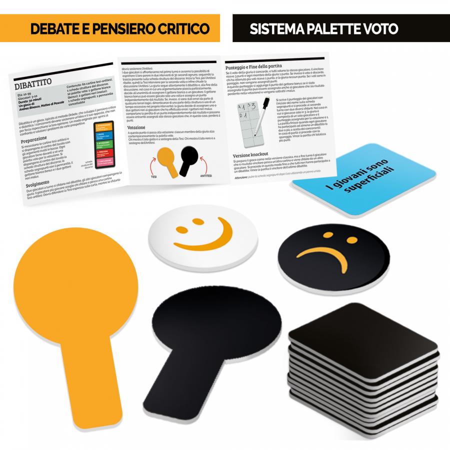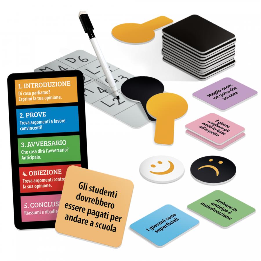 Contenuto: 60 cartine tesi-antitesi; 10 palette voto; 1 gettone bianco (bonus); 2 gettoni neri (malus); 1 scheda struttura del discorso; 1 scheda segnapunti; 1 pennarello cancellabile, Regolamento