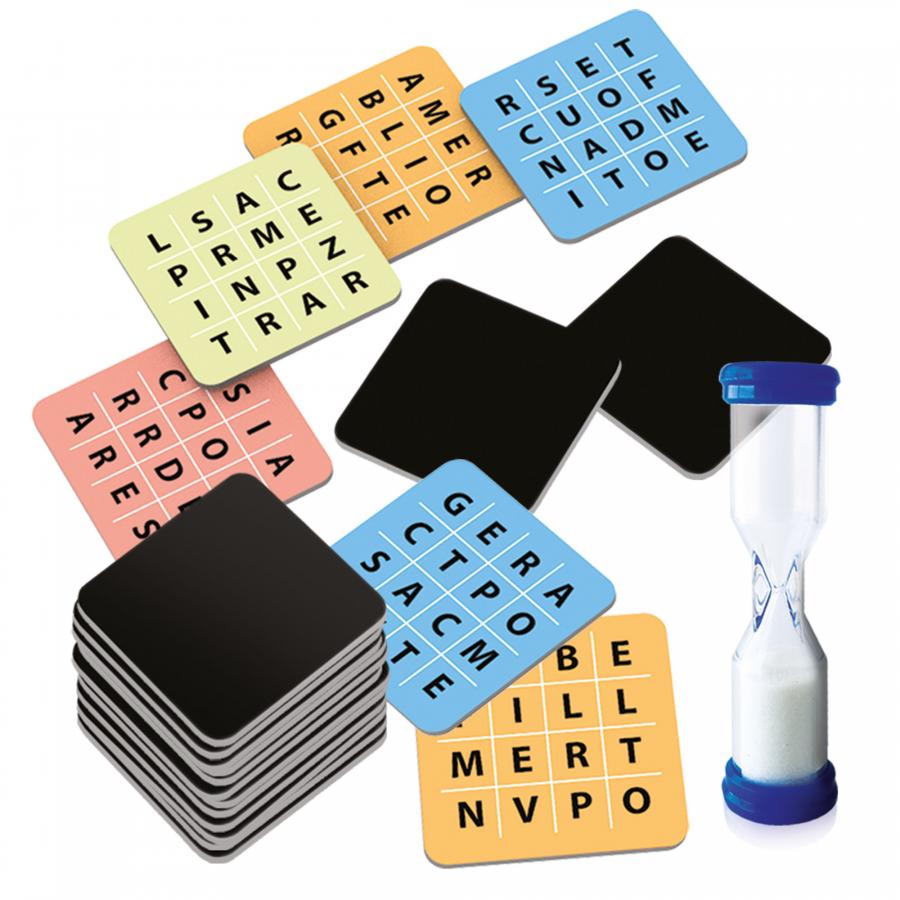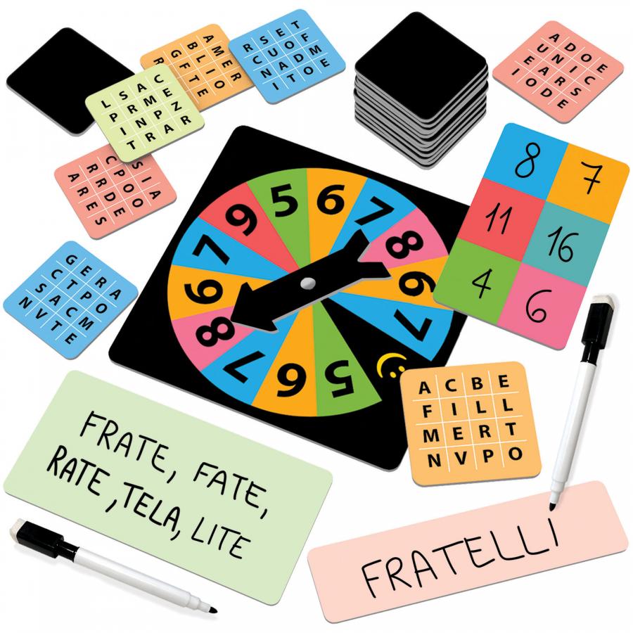 Contenuto: 45 Cartine-lettere; 1 spinner; 1 clessidra; 2 lavagnette; 1 pennarello cancellabile; 1 scheda segnapunti; Regolamento