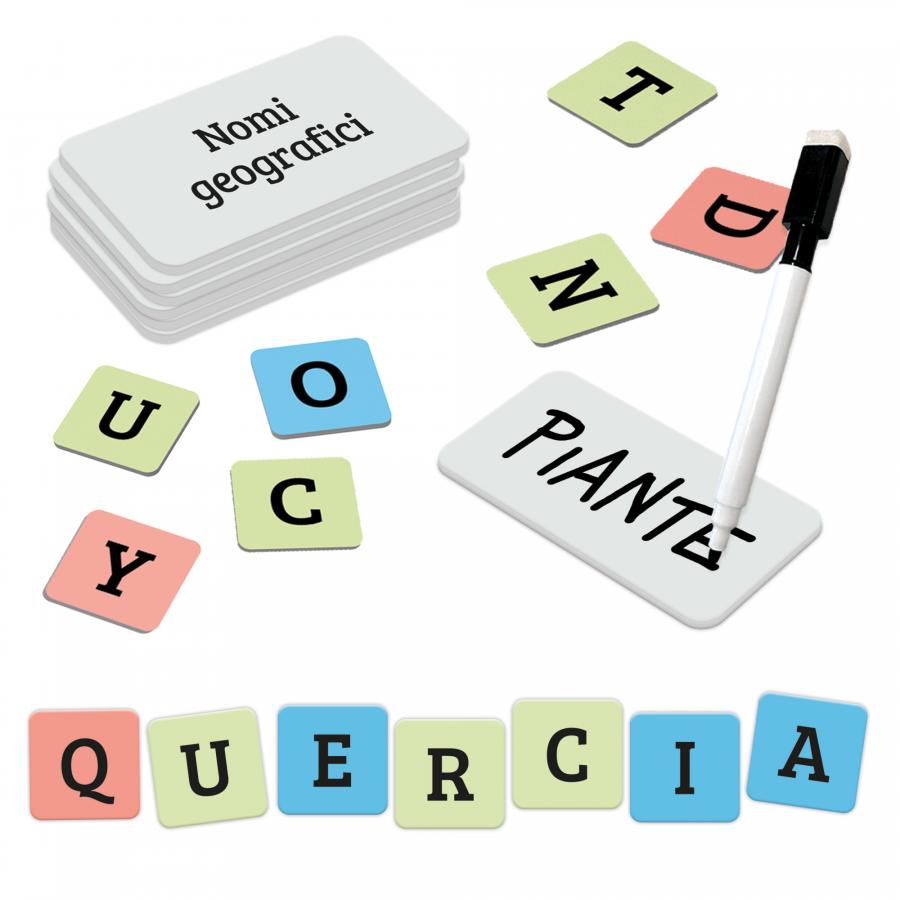 Contenuto: 69 tessere-lettera; 10 cartine-categoria; 4 tessere jolly; 1 lavagnetta; scheda segnapunti; 1 pennarello cancellabile; Regolamento