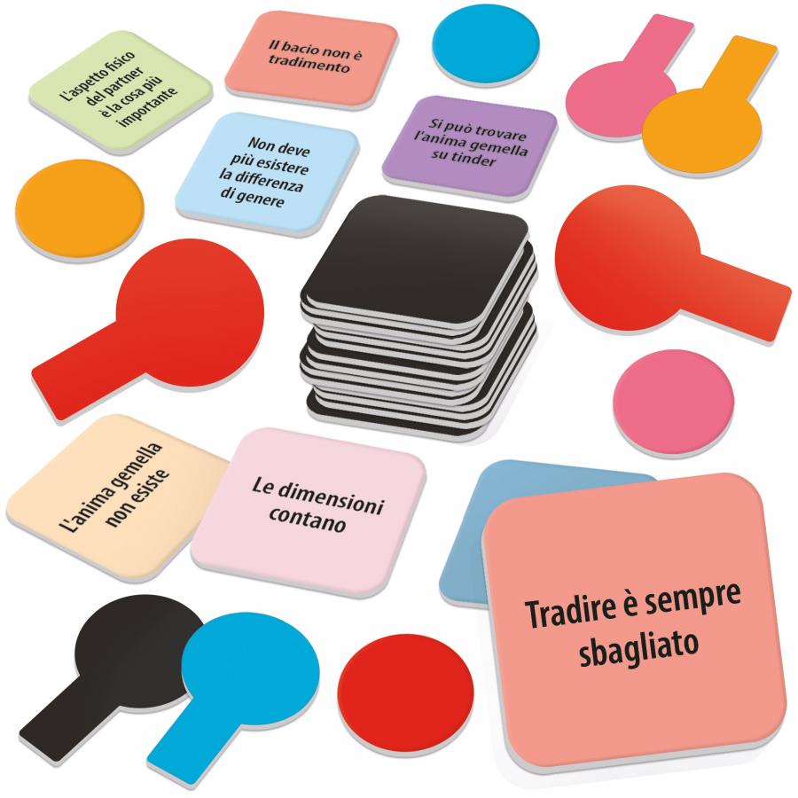 43 cartine tesi-antitesi; 5 cartine struttura del discorso; 12 palette voto; 4 gettoni segnaposto; Regolamento