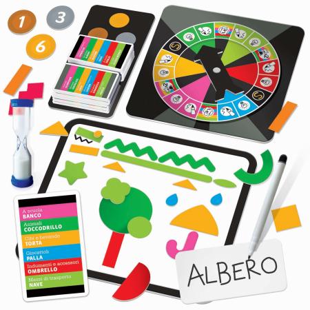Contenuto: 1 mazzo di carte parola; 60 sagome creative; 1 lavagna; 1 spinner; 1 pennarello cancellabile; 4 mini-lavagne; 27 gettoni punteggio; 1 clessidra; Regolamento