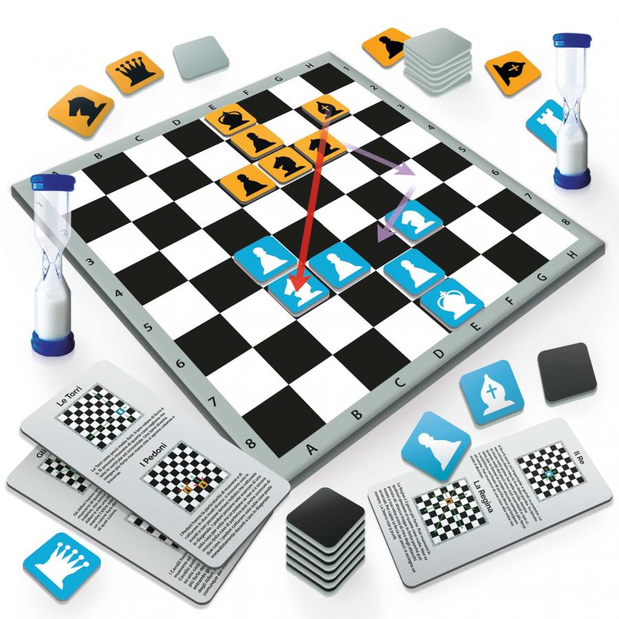 Contenuto: 1 tabellone componibile; 1 clessidra; 22 tessere-pezzo; 18 tessere pedone, Regolamento