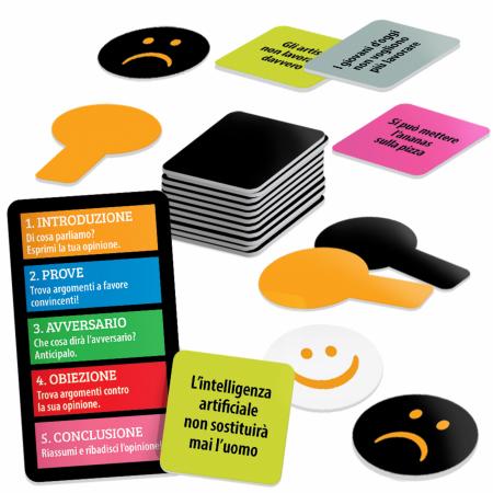 Contenuto: 50 cartine tesi-antitesi; 8 palette voto; 1 gettone bianco (bonus); 2 gettoni neri (malus); 1 scheda struttura del discorso; Regolamento