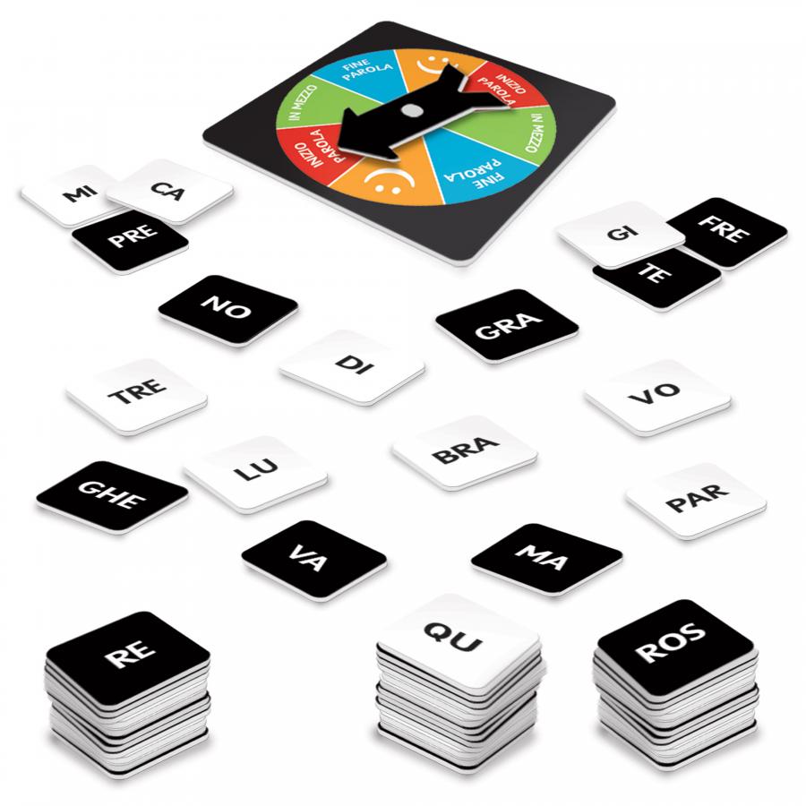 STRA, CHI, MEN, BA… Pesca 10 tessere, gira lo spinner e dài il via alla sfida: trova più vocaboli degli avversari che contengano i gruppi di lettere all’inizio di una parola, in mezzo o alla fine! Vince il più abile e… il più veloce!