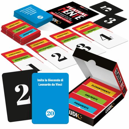 50 carte situazione; 40 carte con 120 avverbi; 10 carte numero; Regolamento