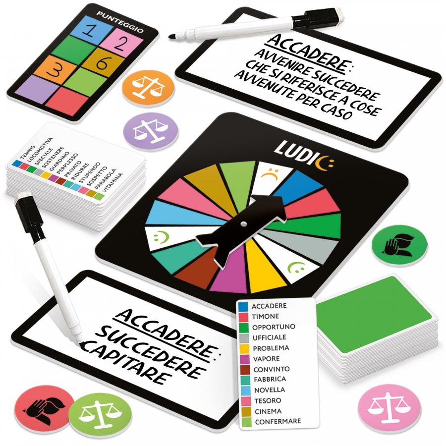 Contenuto: 1 mazzo di 60 carte-vocabolo; 1 spinner; 2 lavagnette; 2 pennarelli con cancellino; 8 gettoni-voto; 8 gettoni-veto; 1 scheda segnapunti; 1 tessera vocabolo-supremo; Regolamento