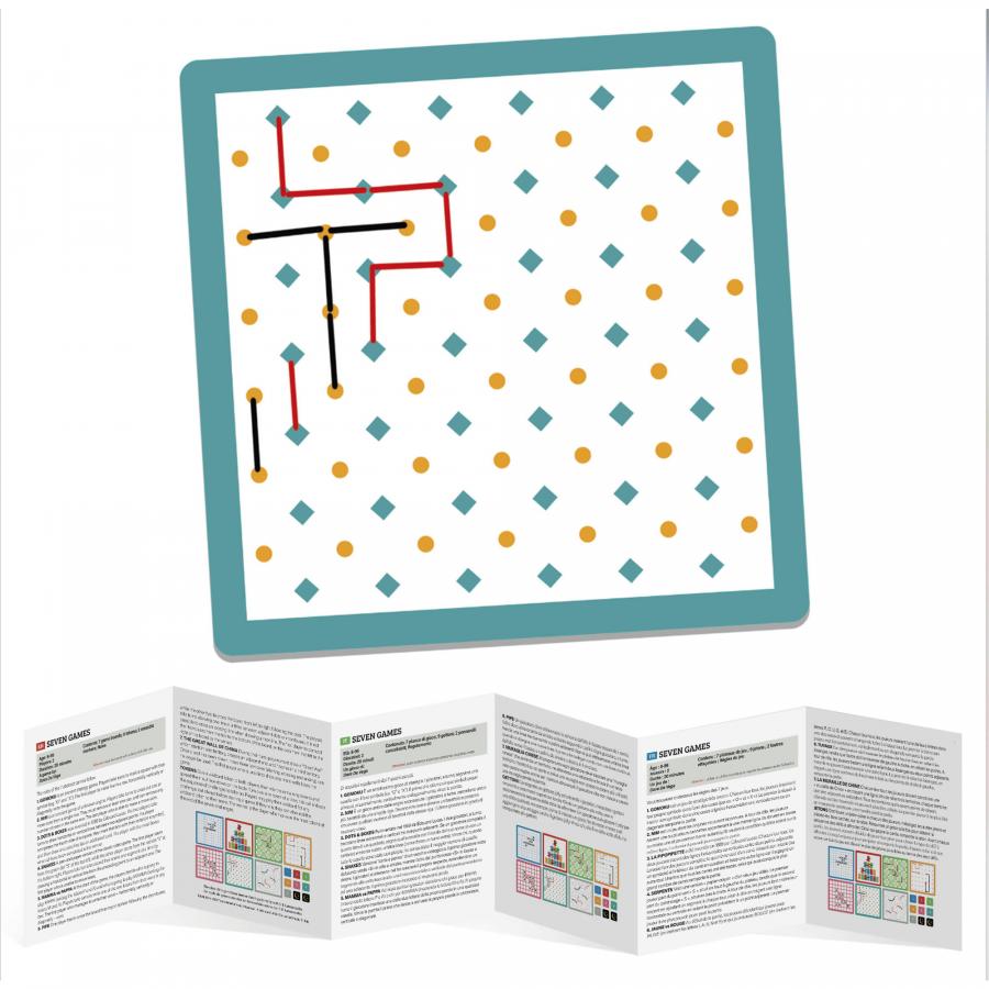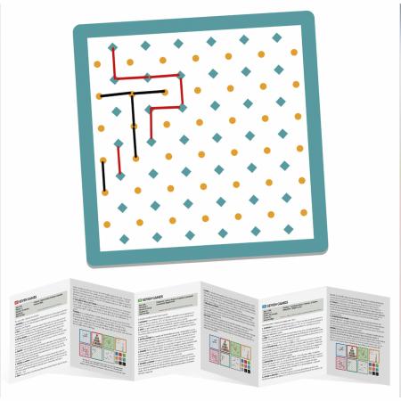 Contenuto: 7 plance di gioco; 9 gettoni; 2 pennarelli cancellabili; Regolamento