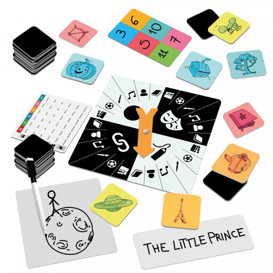 Contenuto: 72 cartine ispirazione; 1 spinner; 1 lavagnetta grande, 1 lavagnetta piccola; 1 pennarello cancellabile; 1 scheda segnapunti; 1 schedina legenda; Regolamento
