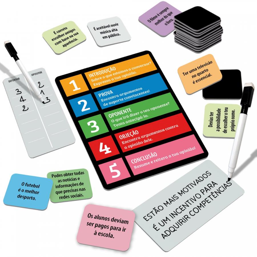 Conteúdo: 42 cartões de moção; 1 cartão de estrutura discursiva; 2 quadros brancos; 1 quadro de pontuação; 2 marcadores apagáveis; Regras