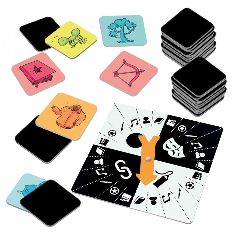 Contenuto: 72 cartine ispirazione; 1 spinner; 1 lavagnetta grande, 1 lavagnetta piccola; 1 pennarello cancellabile; 1 scheda segnapunti; 1 schedina legenda; Regolamento